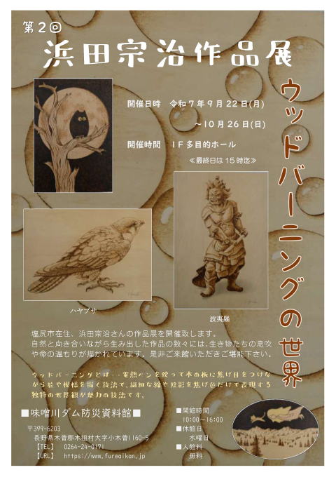 ![]() 浜田宗治 展示会・新聞記事など (最下段へ↓) 今日から10月26日まで 味噌川ダム防災資料館で ウッドバーニングの作品展です。 本人は在駐していませんが。 ![]() ウッドバーニングで 描いた作品を40数点展示します。 場所 長野県木祖村味噌川ダム防災資料館 (木曽川源流ふれあい館) 日時 9月22日から10月26日まで 休館日 水曜日 開館時間 10時から4時 休館日 水曜日 入館料 無料 塩尻市内から、車で40分位の山の中です。 近くにお寄りの際は覗いてみてください。 (といってもたまたま通りかかるという場所はないけど) ![]() 2025年 4月3日より4月30日まで 木曽の「目覚めの床」近くにある (対岸なので、道は違いますが) 「かんでんギャラリー」で 「ウッドバーニングで描いた野鳥展」 を開催します。 50点ほどの作品を展示します。 以前、展示発表した作品が多いので、 ぜひと言うわけではありませんが、 機会があれば覗いてみてください (平日のみなので注意) 1.出展名 「ウッドバーニングで描く野鳥」展 2.展示期間 令和7年4月1日(火)13時から 4月30日(月)10時まで 平日9時~17時(土日・祝日を除く) (休日開放日) 令和7年4月12日(土) 9時~15時30分 令和7年4月20日(日) 9時~15時30分 3.場所 木曽郡上松町小川3024番地1 関西電力株式会社 木曽水力センター 1F 「かんでんギャラリー」 4.入場料 無料 ![]() ![]() ![]() ![]() ![]() ![]() ![]() ![]() ![]() ![]() ![]() ![]() ![]() 写真の木曽川源流ふれあい館で 2024/9月30日から10月27日まで個展をやります。 こんな山の中まで見に来てくれる人がいるのかなあ ![]() ![]() ![]() ![]() ![]() ![]() ![]() ![]() 会場の木曽川源流ふれあい館 (味噌川ダム防災資料館) ![]() 味噌川ダム ![]() 味噌川ダム ![]() 10月4日の市民タイムスに掲載 MGプレス 「偶然が無心になれる楽しみに ウッドバーニング作品を制作・浜田宗治さん」 (2024/04/02) ![]() ![]() 熱した金属のペンで木に焦げ目を付けて 絵や模様を描く「ウッドバーニング」。 塩尻市北小野の浜田宗治さん(74)は、 四半世紀ほど前、 偶然この手法に出合ってから ずっと独学で楽しみ、展覧会も開いた。 細かい焦げ目を無数に連ねていくと、 「無心になれる。それがいい」。 大阪府生まれ。 高校時代に山登りで来た信州が気に入り、 大人になって移住した。 幾つかの職を経て、 松本市アルプス公園(蟻ケ崎)の 「小鳥と小動物の森」の飼育員になった。 世話する生き物たちの木彫りを趣味で作っていて、 焼いて署名を入れるのに使っていたのが電熱ペンだ。 ある日、ベニヤ板で手作りした扉に装飾がほしいと、 試しに電熱ペンで焦げ目を付け始めた。 「これで絵が描ける」と気付いた。 定年を迎える頃のことだ。 インターネットで調べてウッドバーニングを知った。 専用の高価な電熱ペンまであった。 生まれつき色覚障害がある浜田さんは、 焦げ色だけで表現する手法が 「僕に合っていると思った」という。 道具を買い、好きな鳥をベニヤ板に描き始めた。 「楽しくて、寝る間も惜しかった。 最初は1本の線だったのが、 だんだん形になっていく。 そういうのが好きみたい。 完成に近づくとうれしいんだ」。 画題は、ネコなどの動物や人物、 風景に広がっていった。 ウッドバーニングは、一度付けた焦げ目は消せない。 大きなミスは修正できないので、 くっきりとした線より、 細い線を重ねた毛並みで輪郭を表現するような 動物の方が向いているという。 「展覧会をやってみないか」 と声がかかったのは定年して数年後。 松本市のコミュニティー施設で開くと反響があり、 その後、博物館などでも作品を披露してきた。 「買いたい」という人もいて、 「売れるんだ」と驚いた。 値付けも独自。時給千円で制作時間を掛けると、 「だいたい1枚1万円くらい」という。 これまで千枚以上の作品を描いた。 これからも気ままに制作活動を続けるという。 ホームページに作品や連絡先を掲載している。 ![]() 市民タイムス(2024/01/18) 「バードケーキ」 ![]() 市民タイムス(2024/01/09) 「すずめの戸締まり」 ![]() 夏休み昆虫展 同時開催 浜田宗治 ウッドバーニング展 塩尻市立自然博物館 2023/07/22-2023/08/27 塩尻市立自然博物館で今日から 「夏休み昆虫展」が開催されます。 同時開催として 僕のウッドバーニングで描いた カエル20点が展示されます。 よかったら覗いてみて下さい。 ついでに常設展の方では僕の 植物画30点ほど展示されていますので そちらのほうもどうぞご高覧ください。 ![]() 信州の野鳥展 2023/05/13-2023/06/11 9:00-16:30(入館は16:00まで) 塩尻市立自然博物館(小坂田公園内) 塩尻自然博物館自然博物館の企画展で 「信州の野鳥展」が開催されました。 ウッドバーニングで描いた野鳥や バードカービングや鳥の巣などを出展しました ![]() ウッドバーニング ![]() 石の鳥 カルガモの頭部(保護されたカルガモ のヒナの餌付け用に作りました) ![]() ウグイスの巣 ヤマガラの巣 ジョウビタキの巣 コサメビタキの巣 ![]() 読売新聞(2023/05/14) 野鳥の美 堪能100点 塩尻で特別展 写真や剥製 巣の実物も 塩尻市