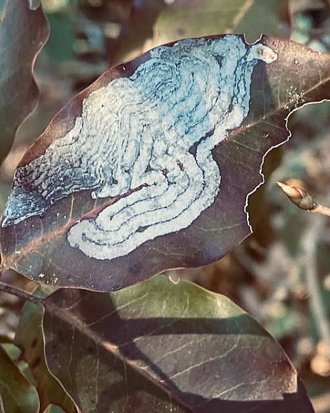 浜田宗治 エッセイ集 毎朝庭を散歩するのが日課なのだけど、 冬は虫がいないもんで いまいち楽しくない。 でも、今朝は絵描き虫(ハモグリバエの仲間) の跡を見つけた。 よく見ると、成長するに従って、 線が太くなっているのがわかる。 葉っぱはソヨゴ。 2025年12月21日