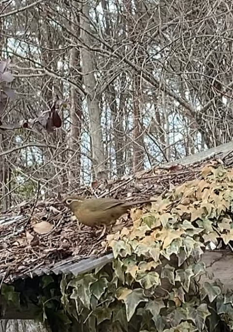 ガビチョウが落ち葉の下の餌を探してます。